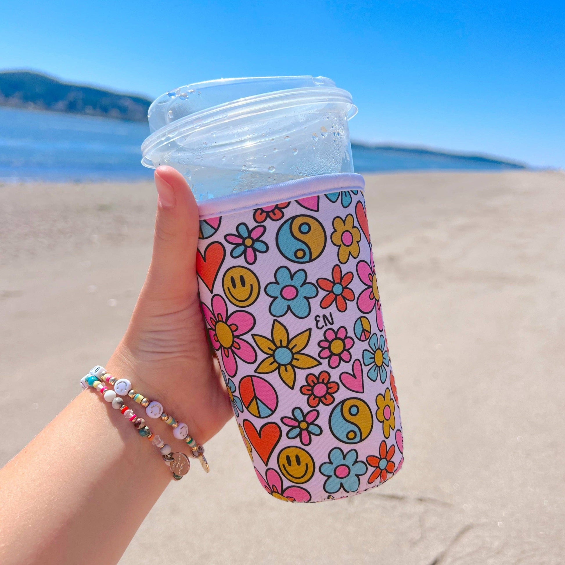 Our best selling funky floral pattern featuring smiley faces, yin yangs, peace signs, florals and the funnest rainbow colors. Iced Coffee Cup Covers make the perfect stocking stuffer!